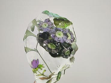 - Wierzch: półprzezroczysta tkanina z nadrukiem kwiatowym (zieleń/fiolety/biele) i aplikacją drobnych, połyskujących dżetów