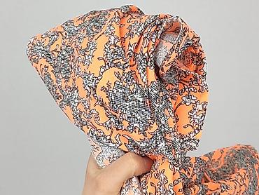 Bluzka damska z krótkim rękawem, wzór kwiatowy. - Kolor: intensywny pomarańcz z wielobarwnym, roślinnym printem (odcienie zieleni, fioletu, różu i kremu) - Krój: luźny, nietoperzowe rękawy; dekolt...