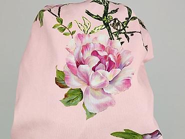 - Wzór: pastelowy róż z nadrukiem gałązek, dużych kwiatów i kolibrów; motyw na całej powierzchni.