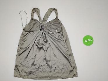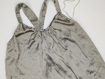 Top damski bez rękawów w kolorze jasnoszarym. - Krój luźny, lekko marszczony z przodu i u dołu, tworzący miękką, zwiewną linię. - Dekolt w kształcie litery V ozdobiony lamówką z cekinami i kolorow...