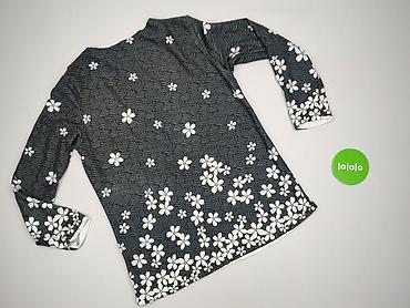 Bluzka damska z długim rękawem, rozmiar M. - Krój: klasyczny, okrągły dekolt z lamówką w odcieniu szarości. - Wzór: drobne kwiatki na jasnoszarym tle (biel, róż, czerń). - Materiał: lekka, przyjem...