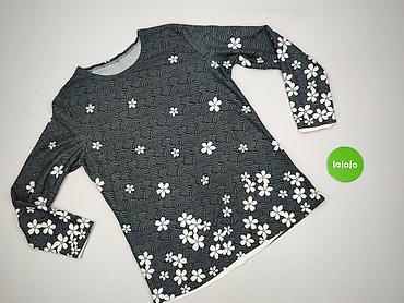 Damska bluzka z długim rękawem, melanżowa szarość z czarnym roślinnym nadrukiem. - Krój: prosty, z okrągłym dekoltem - Rękaw: 3/4 do pełnej długości (lekko zwężany), z wyraźnym kwiatowym motywem p...