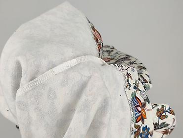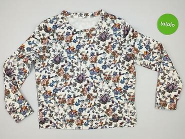 Bluza damska z długim rękawem, w całości pokryta wielokolorowym, roślinnym printem na kremowym tle. Klasyczny, okrągły dekolt, prosta linia i wygodne ściągacze przy dole oraz rękawach. Materiał średniej grubości, miękki od spodu (drapana, pętelkowa lewa strona) – przyjemny w noszeniu, elastyczny i dobrze trzyma kształt. Nadruk łączy odcienie granatu, fioletu, pomarańczu i zieleni, co ułatwia zestawianie z jeansami i gładkimi dołami. Idealna na co dzień i do casualowych stylizacji. Dla kobiet. Używana.