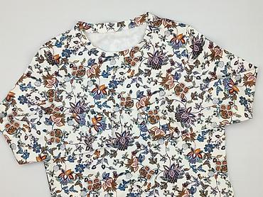 Bluzka damska z nadrukiem roślinnym - Krój: luźny, z krótkim rękawem - Dekolt: okrągły - Przód: biały z artystycznym, zielono‑turkusowym motywem kwiatów i gałązek - Tył: gładki, biały - Dół: asyme...