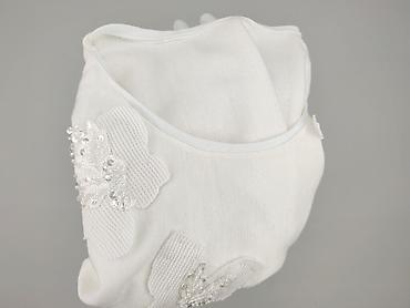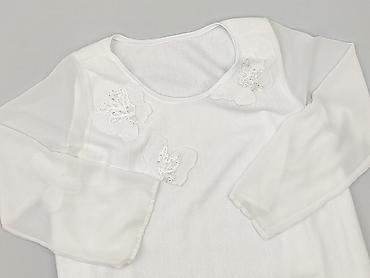Biała bluzka dziewczęca bez guzików z krótkim rękawem. - Fason: luźna góra, dół wykończony elastyczną gumką. - Kołnierzyk: zaokrąglony typu „Peter Pan”, zdobiony drobnymi aplikacjami/kropkami; z t...