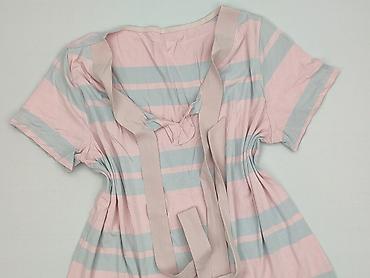 Bluzka damska z krótkim rękawem, lekko oversize. - Kolorystyka: pudrowy róż z szaro‑niebieskim i oliwkowym printem w pasy oraz motyw kwiatowy. - Dekolt: okrągły. - Rękawy: marszczone z możliwością...
