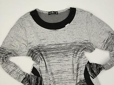 Damska bluzka z dzianiny, szara w drobne poziome prążki. - Fason: luźny, lekko rozszerzany do dołu (A-line), z zaokrąglonym dołem. - Dekolt: w kształcie litery V. - Rękaw: długi. - Materiał: miękk...Rozmiar:
