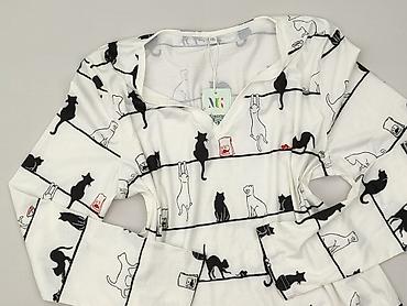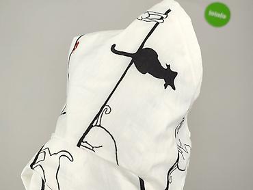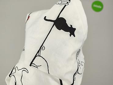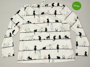 Bluzka damska z krótkim rękawem, rozmiar L. - Kolor: biały w nadruk czarnych kotów (powtarzający się, graficzny motyw). - Krój: dopasowany, lekko taliowany; okrągły dekolt. - Materiał: cienki, g...