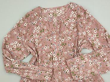 Bluzka damska z długim rękawem, 2XS - Fason: lekko luźny, z kopertowym przodem (imitacja zakładki) i okrągłym dekoltem - Wzór: kwiaty i motyle na pudrowo‑różowym tle; odcienie błękitu, bieli, ziel...