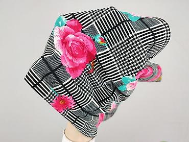 - Wzór: czarno‑biała krata (mix pepitki i pasków) z dużymi, intensywnie różowymi różami oraz drobnymi kwiatkami w żółci i turkusie