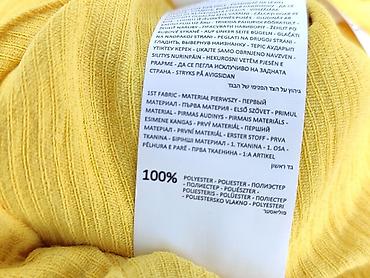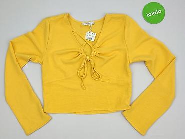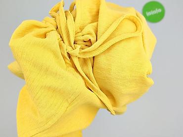 Żółta bluzka damska z krótkim rękawem - Krój: luźny, z obniżoną linią ramion; dekolt w kształcie litery V z ozdobną plisą. - Rozmiar: S (z metki). - Materiał: 95% poliester, 5% spandex – lekko ela...