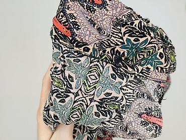 - Wzór: etniczny/boho, zygzaki i roślinne motywy w odcieniach czerni, koralu, zieleni, beżu i fioletu; dół wykończony czarną falbaną.