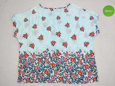 Bluzka damska z krótkim rękawem, turkusowa z dużym, kwiecistym nadrukiem w odcieniach różu, fuksji, fioletu i zieleni. - Krój: luźny, swobodny, delikatnie rozszerzany na dole - Dekolt: szeroki, łó...