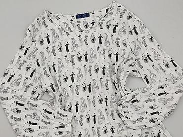 Bluzka damska La Blanche, rozmiar 40 - Kolor: biały z nadrukiem kaligraficznych napisów (all-over) - Fason: luźniejszy, dłuższy tył, zaokrąglony dół; dekolt w serek z krótką listwą guzikową (złote...