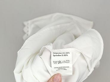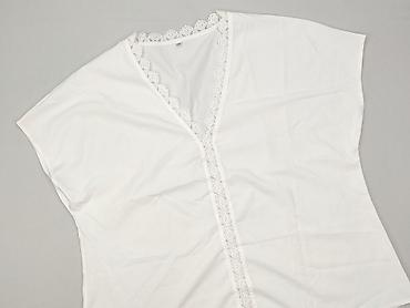 Biała bluzka damska z krótkim rękawem i półokrągłym dekoltem. Lekko luźny, swobodny krój. Tkanina o wyraźnej, fakturowanej strukturze (delikatny żakard/krepa), przewiewna i miękka w dotyku. Dół z t...