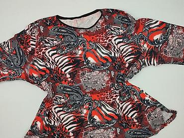 Bluzka damska z krótkim rękawem, wzór abstrakcyjny - Rozmiar z metki: 50 - Krój: luźny, tunikowy - Dekolt: łódka z marszczeniem - Rękawy: krótkie, z troczkami do regulacji/marszczenia - Długość: d...