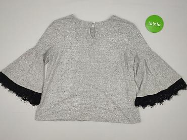Bluzka damska z długim rękawem - Kolor: jasnoszary z czarną, ażurową koronką przy dekolcie - Fason: lekko luźny, prosty dół - Rękawy: długie, delikatnie zwiewne - Dekolt: ozdobny, trójkątnie opada...Stan: