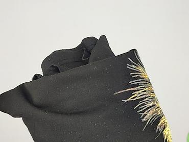 Bluzka damska z krótkim rękawem, czarna, z efektownym nadrukiem piór w odcieniach beżu, bieli i srebra. Dekolt szeroki, zaokrąglony. Krój lekko tunikowy z elastycznym marszczeniem w pasie i falując...