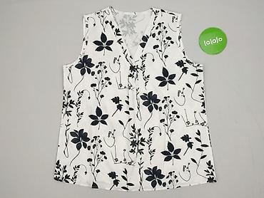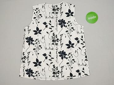 Bluzka damska bez rękawów z dekoltem w serek, rozmiar L. Biała, w czarny botaniczny nadruk (liście i kwiaty). Lekko rozszerzany fason, miękki i przewiewny materiał.