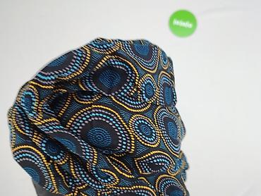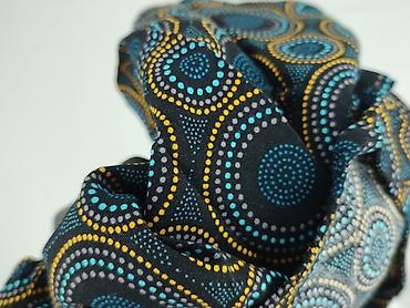 - Wzór: geometryczne, koncentryczne kółka w odcieniach niebieskiego, turkusu, szarości i musztardowej żółci na czarnym tle.