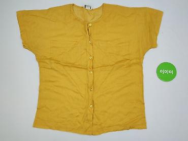 Bluzka damska z krótkim rękawem, pastelowożółta. - Krój: luźny, prosta linia z rozcięciami po bokach u dołu. - Zapięcie: ozdobny rząd dużych, materiałowych guzików z przodu (dekoracyjne, asymetryc...