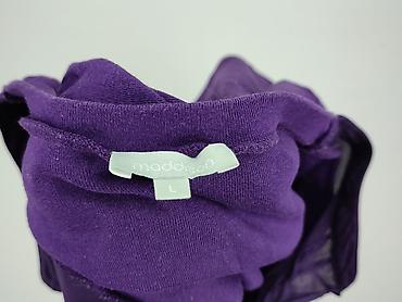Bluzka damska z długim rękawem, rozmiar L. Wzór w szerokie poziome pasy w odcieniach fioletu z białymi akcentami. Okrągły dekolt, dekoracyjne guziki na obu ramionach. Rękawy zakończone delikatnym ś...