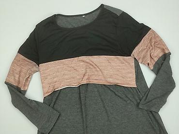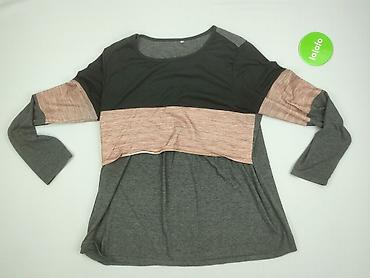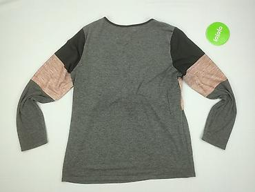 Bluzka damska z długim rękawem, rozmiar L. - Fason: klasyczna bluzka z okrągłym dekoltem, prosty krój. - Wzór: dynamiczne, faliste linie w kolorach różowym, czarnym i jasnoszarym na szarym tle. - ...