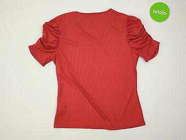 Bluzka damska w intensywnym czerwonym kolorze. - Fason: prosty, lekko taliowany, dekolt okrągły - Rękawy: 3/4 z delikatną falbaną przy mankiecie - Rozmiar z metki: 8 (proszę porównać z własnymi wy...