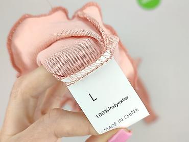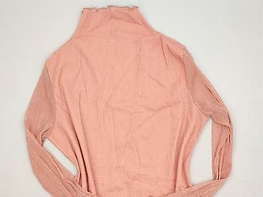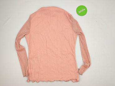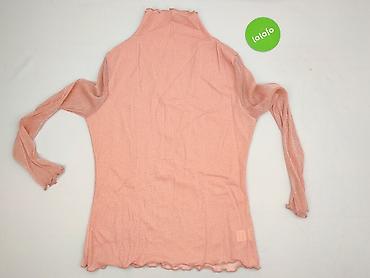 Damska bluzka z długim rękawem w kolorze pudrowego różu. Lekko połyskująca, cienka i elastyczna dzianina, wykończenia falbankowe przy stójce oraz u dołu i przy mankietach. Krój dopasowany, ze stójką. Materiał: 100% poliester (na metce). Rozmiar z metki: L. Idealna do stylizacji codziennych i wieczorowych, świetnie wygląda warstwowo pod marynarką lub kamizelką.