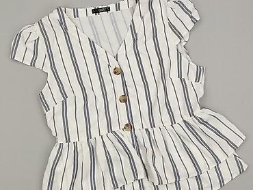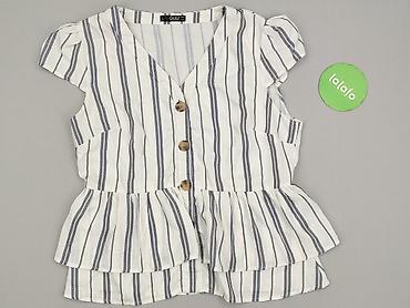 Bluzka damska QUIZ - Model: koszulowa bluzka w paski - Kolor/wzór: biało‑niebieskie, cienkie paski - Rękawy: krótkie, z wycięciami na ramiona (cold shoulder) i wiązaniami - Zapięcie: na guziki z p...