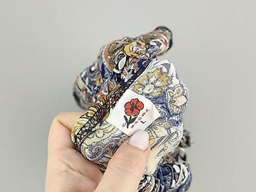 - Wzór: bogaty, orientalno‑paisley w odcieniach granatu, musztardy, bieli i brązu