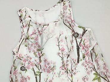 Bluzka damska bez rękawów z lekkiego szyfonu, w kwiatowy wzór (gałązki i różowe kwiaty) na białym tle. Luźny, zwiewny fason z dłuższym, zaokrąglonym tyłem i efektowną, nakładaną warstwą z przodu tworzącą lekki „waterfall”. Okrągły dekolt.