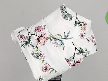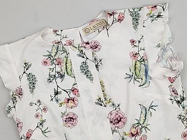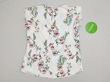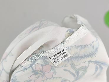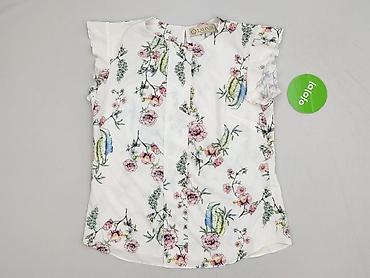 Bluzka damska z kołnierzykiem, rozmiar 40. - Fason: tunikowy, lekko wydłużony, zapinany na 3 guziki pod szyją - Rękaw: 3/4 - Kołnierz: stójka/kołnierzyk - Wzór: kwiaty na tle w poziome pasy (biel,...