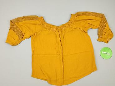 Bluzka damska hiszpanka, żółta, z ażurowymi wstawkami - Fason: odkryte ramiona (hiszpanka), lekko luźna, z asymetrycznym dołem zakończonym frędzlami - Rękawy: do łokcia, z szerokimi koronkowymi/si...