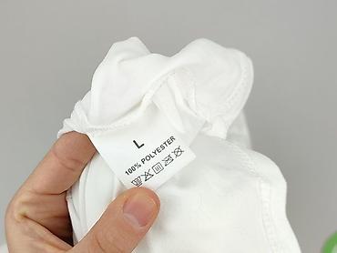 Biała bluzka damska z krótkim rękawem - Fason: luźny, oversize; lekko opadające rękawy - Dekolt: w kształcie litery V z krótką stójką - Materiał: 100% poliester (metka na zdjęciu) - Rozmiar z metk...