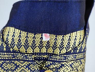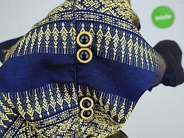 - Wzór: gęsty, geometryczny/etniczny deseń w odcieniach granatu i złota; poziome pasy podkreślające talię