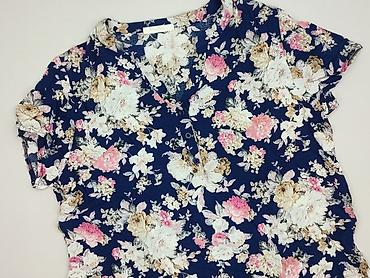 Bluzka damska z krótkim rękawem, w granatowym kolorze z kwiatowym nadrukiem. - Fason: lekko luźny, z rozcięciem pod szyją i listwą guzikową (4 guziki z przodu) - Rękawy: krótkie, delikatnie marsz...Rozmiar: