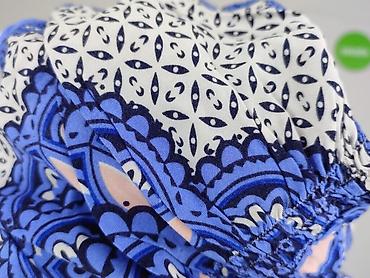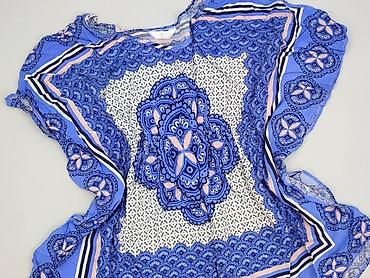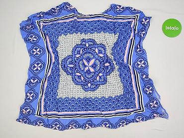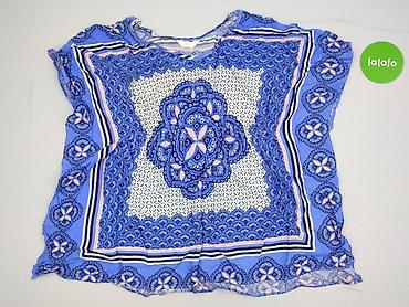 Bluzka damska, rozmiar L. Zwiewna, lekka tkanina z wyrazistym, etnicznym/boho nadrukiem w odcieniach błękitu, granatu, bieli i pudrowego różu. Centralny, symetryczny motyw z ramką dookoła, drobny wzór na białym tle wewnątrz. Krótki rękaw, luźny fason typu tunika, idealny na lato lub jako narzutka do szortów i spódnic. Miękki, przyjemny materiał, szybkoschnący, niegniotący się.