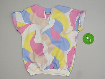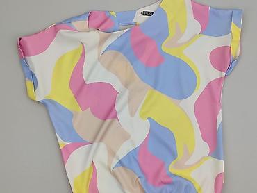Bluzka damska BEL&BO, rozmiar M. - Kolorystyka: fiolet, pomarańcz, biel; wzór kwiatowo-abstrakcyjny w stylu retro. - Krój: dekolt w serek, lekko dopasowana talia. Krótkie, szerokie, transparentne ...