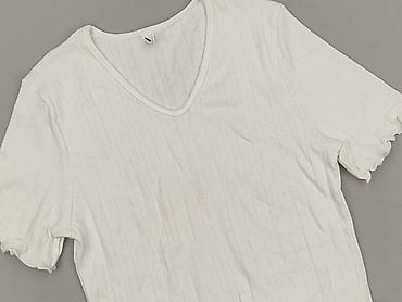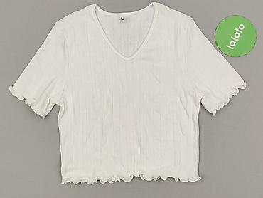 Biała damska bluzka z krótkim rękawem i efektowną koronką przy dekolcie w kształcie litery V. - Rozmiar: M (z metki) - Skład: 95% poliester, 5% spandex – materiał gładki, miękki, lekko elastyczny ...