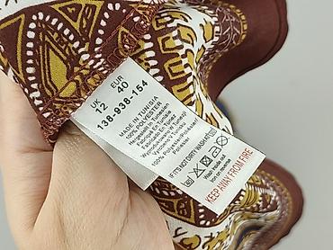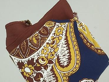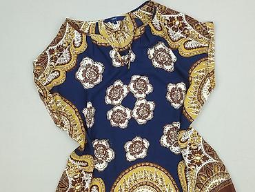 - Wzór i kolory: bogaty, etniczny/ornamentalny print w odcieniach granatu, musztardy, brązu i bieli; bordowa lamówka u dołu