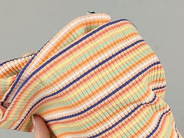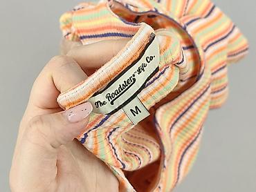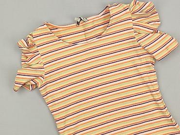 Bluzka damska z krótkim rękawem, oversize/luźny krój. - Wzór: poziome, cieniowane pasy w odcieniach koralowego, różu, moreli i ecru; ramiona z delikatnym ciemnobrązowym akcentem. - Dekolt: okrągł...