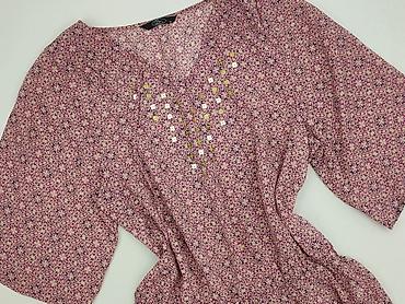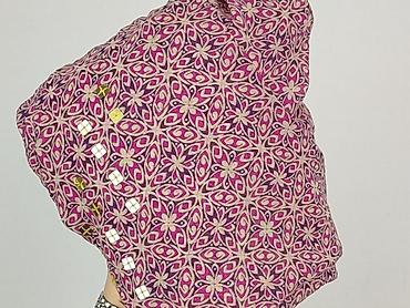 Bluzka damska z krótkim rękawem, rozmiar 40. - Wzór: drobny, powtarzalny motyw wachlarzy w odcieniach niebieskiego na jasnoróżowym tle (styl art deco). - Krój: luźny, prosty, z delikatnie opuszczo...