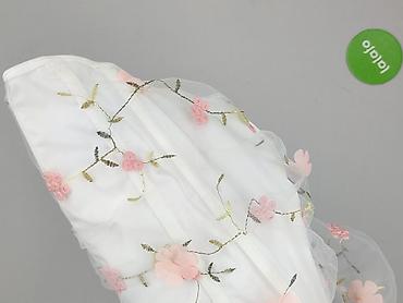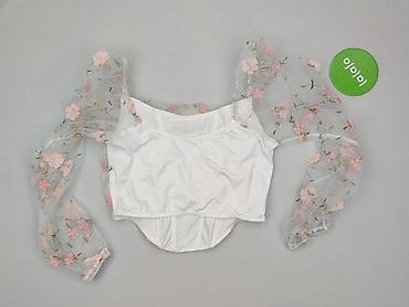 Biała damska bluzka z krótkim rękawem i dekoltem w kształcie litery V, ozdobionym efektowną, niebieską koronką oraz haftem roślinnym. Luźniejszy, prosty krój z małymi rozcięciami po bokach u dołu z...Stan: