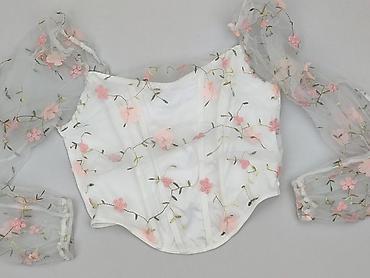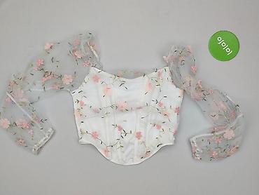 Biała bluzka damska typu gorset z długimi, bufiastymi rękawami z tiulu, zdobiona kwiatowym haftem 3D w odcieniach pudrowego różu i zieleni. Przód usztywniany pionowymi przeszyciami modelującymi sylwetkę, lekko zaokrąglony dół w stylu gorsetowym. Plecy gładkie. Rękawy transparentne, zakończone elastyczną gumką przy nadgarstku.