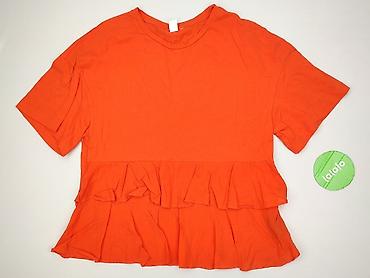 Bluzka damska w kolorze intensywnej pomarańczy. - Fason: luźny, prosty krój - Dekolt: w kształcie litery V - Rękawy: krótkie z falbanką - Rozmiar z metki: S - Materiał: miękka, gładka dzianina (na...