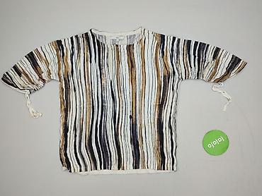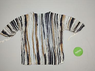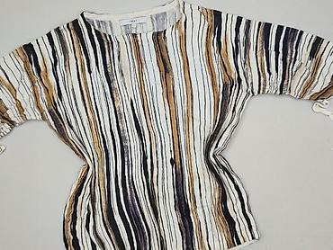 Damska bluzka w paski, rozmiar M - Krój: luźny, oversize’owy, z krótkim kimono-rękawem - Dekolt: w serek z niewielkim rozcięciem - Wzór: pionowe pasy w odcieniach granatu, musztardowej żółci, biel...