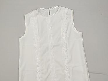 Biała bluzka bez rękawów dla kobiety. Zwiewny, lekko transparentny materiał o subtelnej, ziarnistej fakturze. Ozdobne, koronkowe wstawki na ramionach. Dekolt okrągły z małym rozcięciem i zapięciem ...