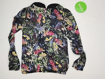 Bluzka damska BLUE, rozmiar 38 (M) - Wzór: gęsty, kwiatowy print na czarnym tle (odcienie bieli, różu i zieleni) - Krój: kobiecy, lekko dopasowany korpus - Rękawy: długie, bufiaste z marszczeniami...