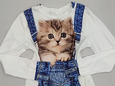 Bluzka damska z długim rękawem, rozmiar M. Biała, z fotorealistycznym nadrukiem kotka „siedzącego” w jeansowych ogrodniczkach (print z przodu i z tyłu, także na mankietach). Miękki, elastyczny materiał zapewniający wygodę; okrągły dekolt. Idealna na co dzień dla miłośniczek kotów i oryginalnych nadruków.